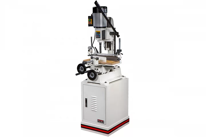 JFM-6 хорошо оснащенный, удобный и точный в работе долбежно-пазовальный станок для любительского применения. Основание, колонна, рабочий стол, упоры и прижимы заготовки выполнены из массивных чугунных отливок, что обеспечивает высокую точность и отсутствие вибраций при работе. В комплект поставки входит металлическая тумба-основание с отсеком для хранения инструментов.