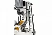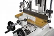 Предусмотрено несколько вариантов фиксации заготовки, что позволяет выбрать наиболее удобный способ работы. Прежде всего, деталь можно вручную прижимать к основному упору, жестко закрепленному на столе параллельно продольной оси подачи. Для подпора с другой стороны есть параллельный ему подвижный упор с эксцентриковым стопором выбранного положения. С двух сторон стола на вертикальных штангах смонтированы два одинаковых вертикальных прижима. Их можно поворачивать на оси и сдвигать вверх или вниз, отжав пластинчатый стопор (как на трубных струбцинах); прижим производится эксцентриковым механизмом. Наконец, для продольного позиционирования заготовок есть торцевой упор с несколькими степенями свободы для установки в разных плоскостях.
